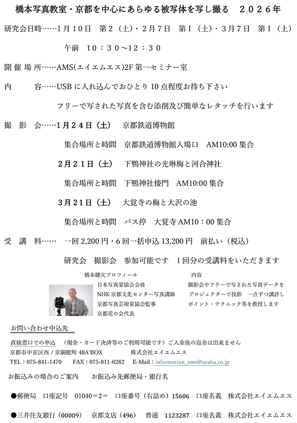 【受講生募集】写真家橋本健次主催 写真教室1月-3月