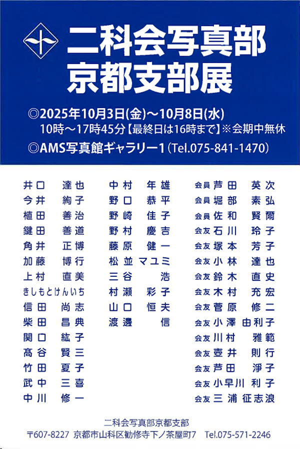 NEWS 詳細表示 【ギャラリー1】二科会写真部 京都支部展 10/3(金)~10/8(水) レンタル 作品展 2025年09月03日 二科会写真部 京都支部展期 間:2025年10月3日(金)~10月8日(水)時 間:10:00~17:45(最終日は16:00まで)場 所:AMS ギャラリー1 戻る