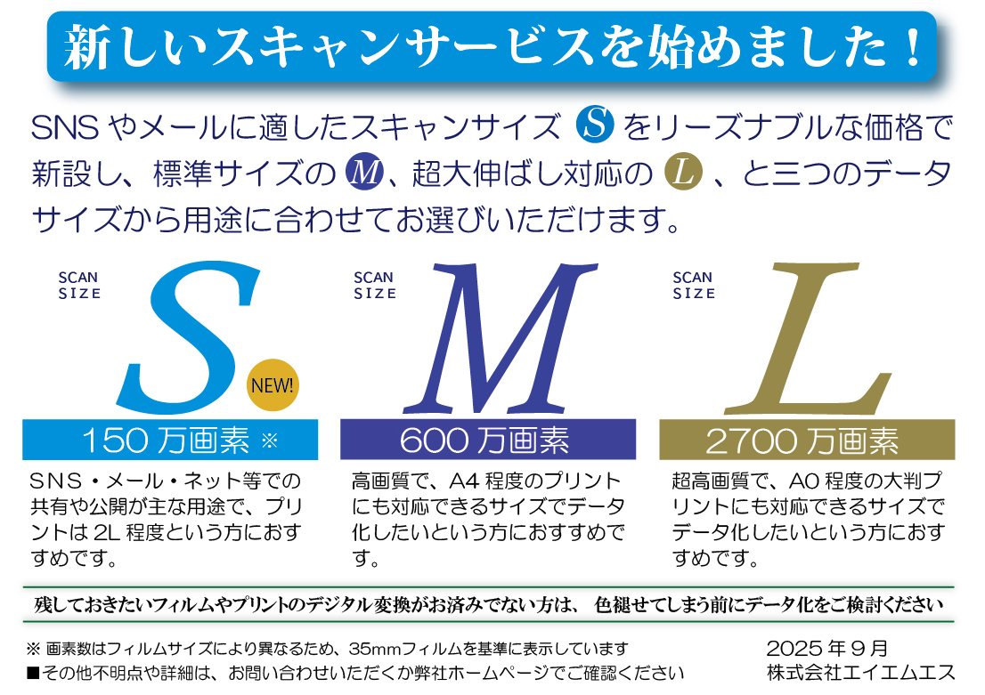 NEWS 詳細表示 新しいフィルムスキャンサービス開始しました! ラボ お知らせ 2025年09月01日 価格はホームページに掲載しております。https://www.amsnet.co.jp/labo/filmdata_price.pdf?v3詳細は「データ化(スキャニング)・フィルム現像」のページをご確認ください。 戻る