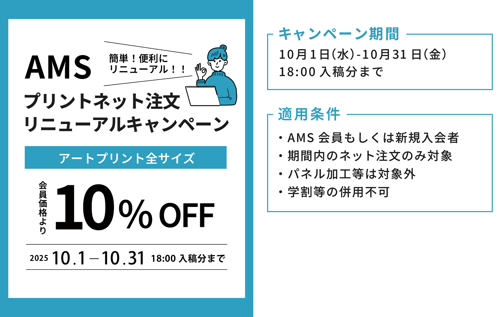NEWS 詳細表示 プリントネット注文リニューアルキャンペーンのお知らせNEW ラボ キャンペーン 2025年10月01日 いつもAMSをご利用いただき誠にありがとうございます。このたび、お客様により快適にご利用いただける様にプリントネット注文がリニューアルいたしました。新しく注文システムを導入し、従来より操作がシンプルになり、簡単に写真プリントのご注文が可能となります。またリニューアルを記念して、【アートプリント全サイズ10%OFF】のキャンペーンを実施します。これを機に、是非ご自宅から写真プリントをご注文ください。新しくなったネット注文は コチラ 戻る