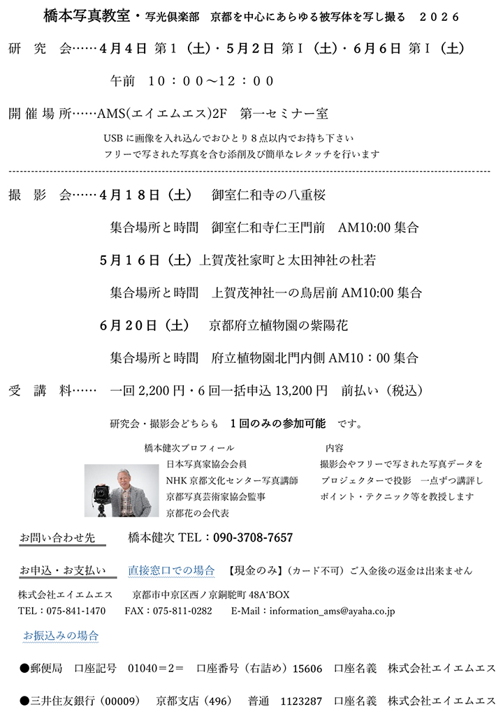 【受講生募集】写真家橋本健次主催 写真教室4月-6月