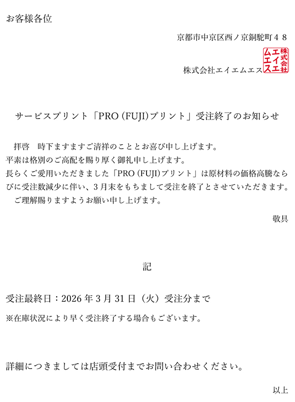 サービスプリント「PRO(FUJI)プリント」受注終了のお知らせ